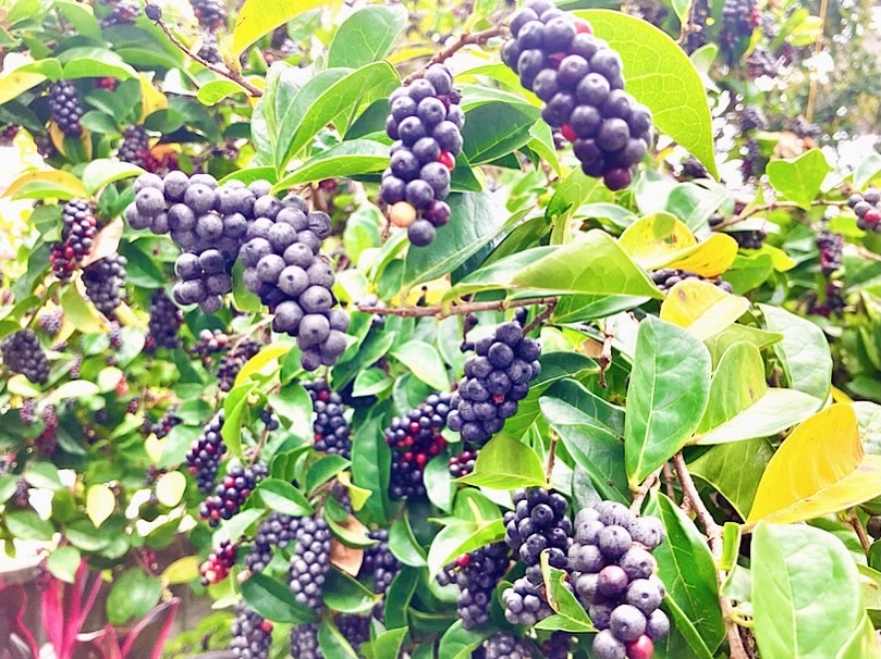 ブルーベリーに似た小さな実が濃紫色(こむらさき)に色付いて葡萄の房のようにタワワに成って、確かに枝葉も塀を越えてわさわさのさばっている^^;